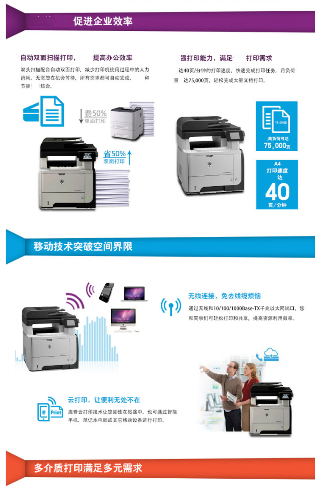 惠普HP A4数码黑白激光多功能打印机一体机 M521dn