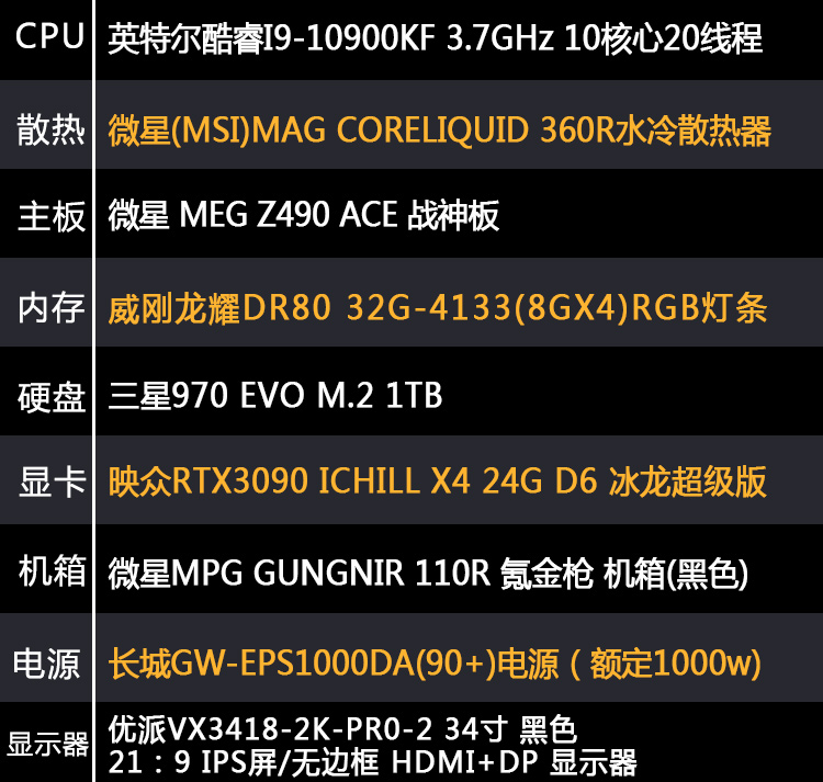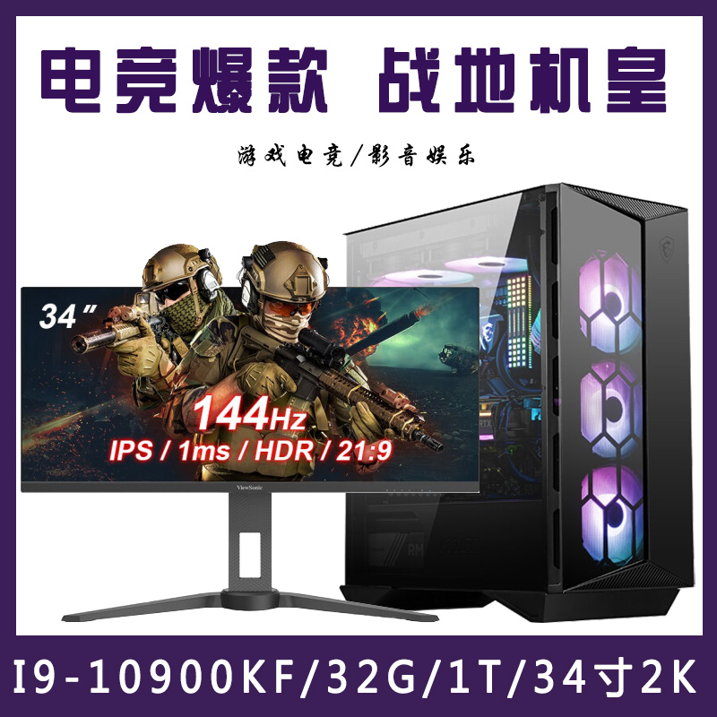 【i9-10900KF整机】酷睿i9-10900K/32G内存/1T固态/ 34寸电竞显示器24G独显办公游戏电竞组装电脑