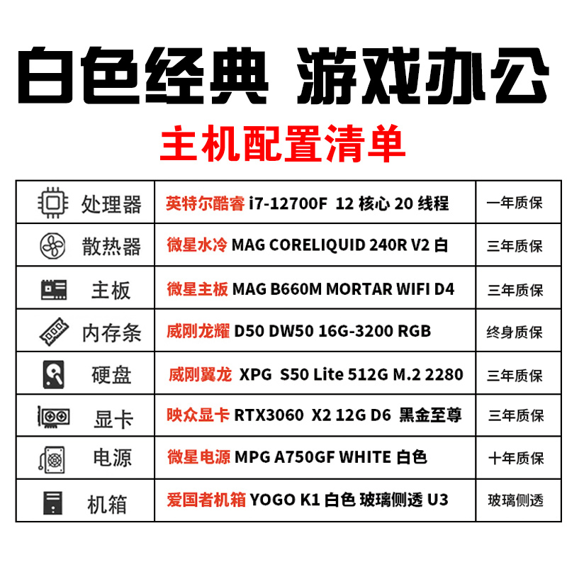 【酷睿i7-12700F白色电竞主机】酷睿i7-12700F/微星B660M/16G/512G/RTX3050 白色经典电竞主机