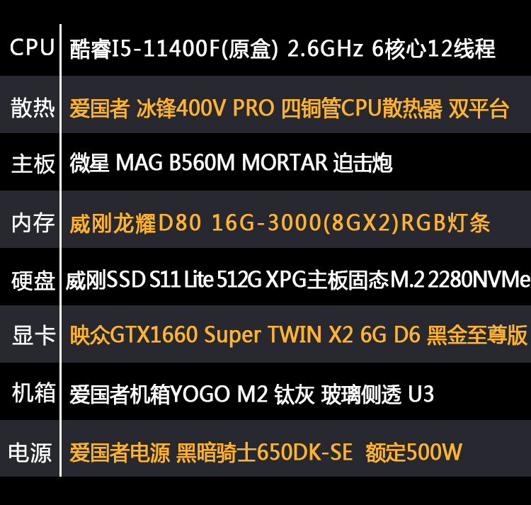 【i5-11400F主机】酷睿i5-11400F/16G内存/512G M.2/GTX1660 Super独显游戏电竞主机