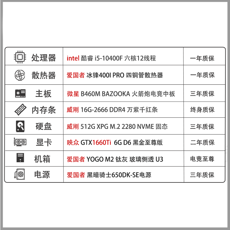 【i5-10400F主机】酷睿i5-10400F/16G内存/512G固态/1660ti独显游戏电竞主机