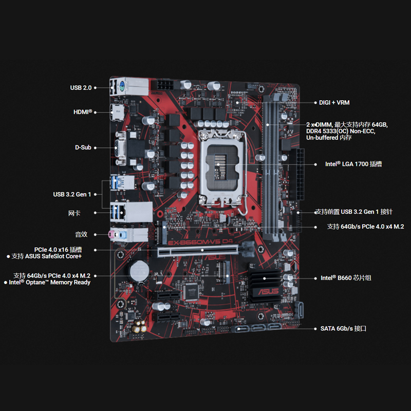 华硕主板PRIME EX-B660M-V5 PRO D4(工包) 2.5G VGA+HDMI