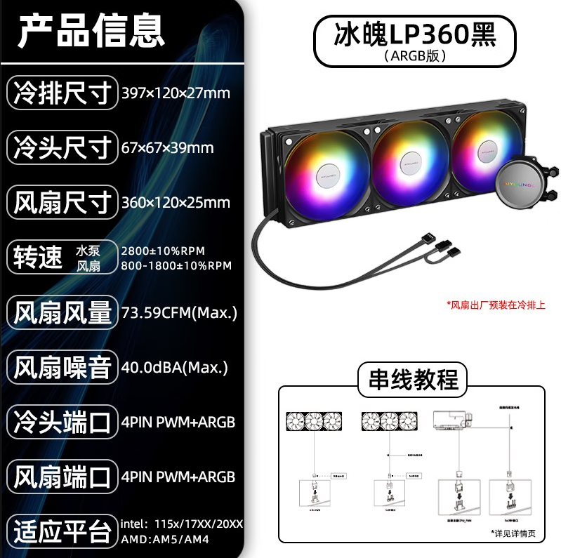 爱国者(aigo)冰魄LP360(黑色) RGB一体式水冷 CPU散热器(ARGB光效/免拼接风扇/陶瓷轴心)