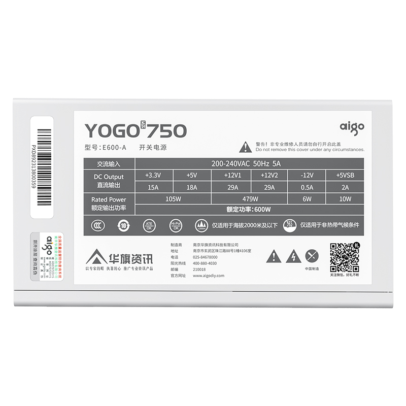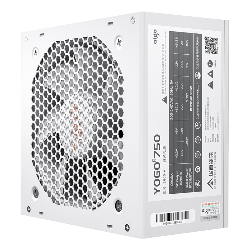 爱国者(aigo) YOGO750 直出线【额定600W】 白色 电脑开关电源 品质电容/宽幅设计/不虚标