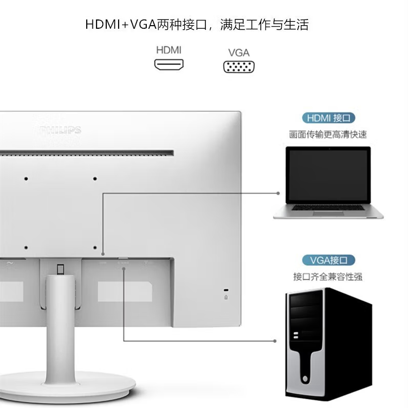 飞利浦241V8W 23.8英寸 IPS屏 全高清 75Hz 低蓝光无频闪 VGA/HDMI 壁挂 网课 办公娱乐显示器