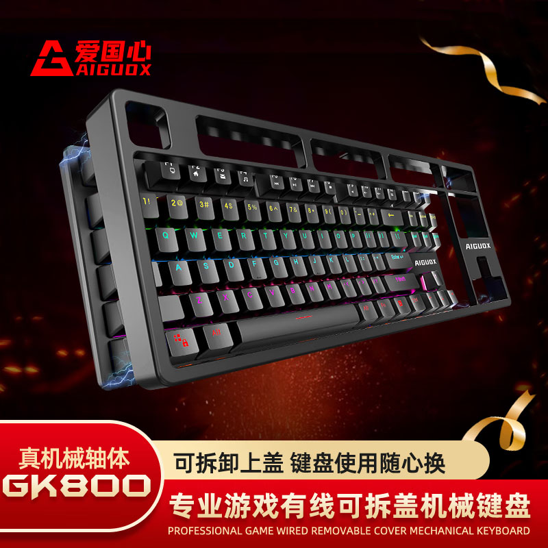 爱国心 GK800 灰+白+橙 青轴 有线游戏机械键盘 RGB背光 可拆卸上盖 87键 电脑笔记本办公