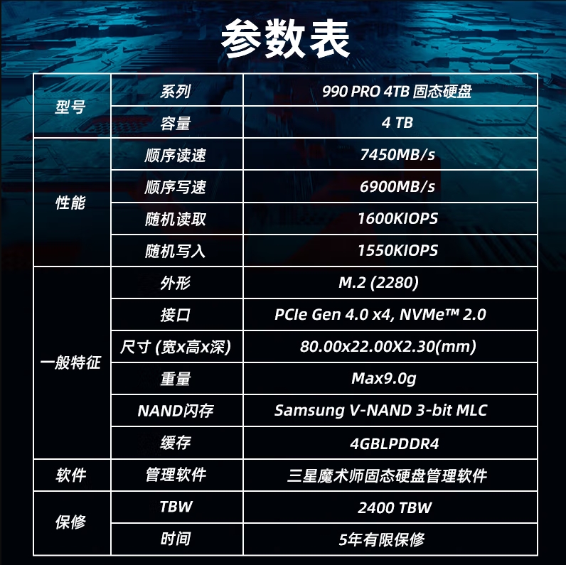 三星(SAMSUNG)990 PRO 4TB SSD固态硬盘 M.2接口(NVMe协议PCIe 4.0 x4)